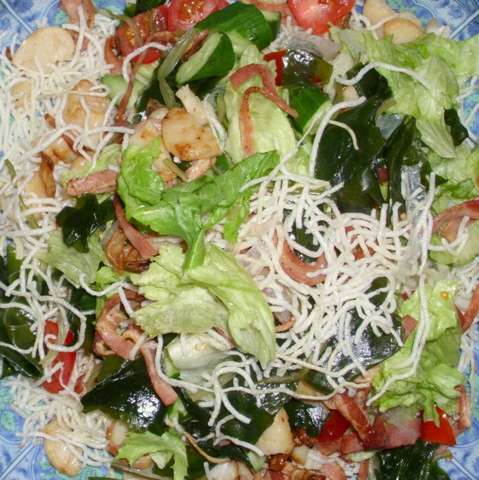 トマト、キュゥリ、レタス、海草、ホタテ貝、細切りベーコン、